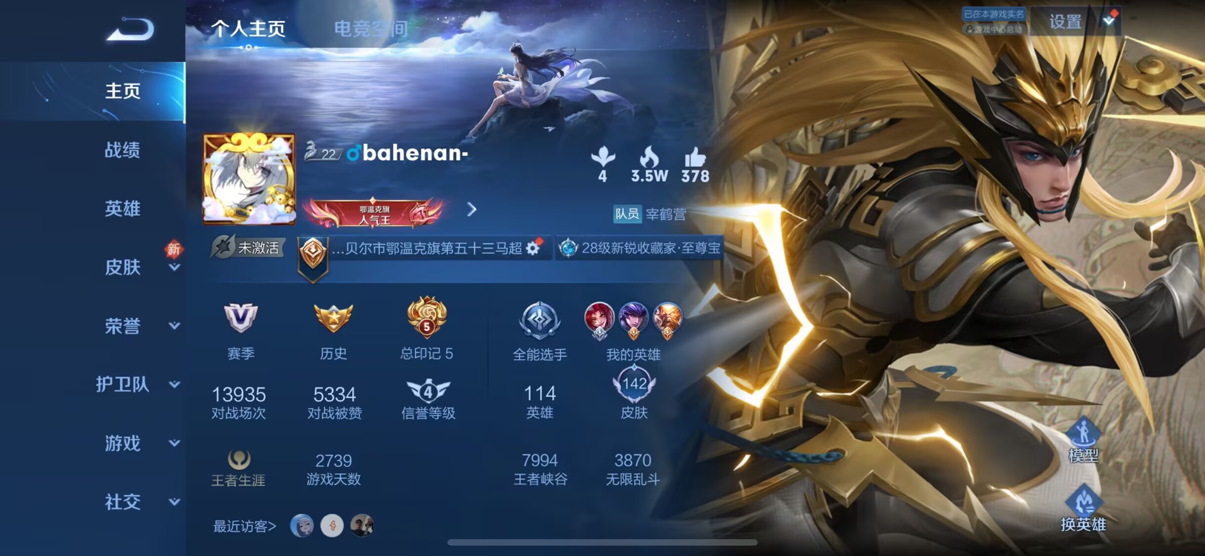 适配系统:苹果 角色名:修养 信誉分:93 账号类型(腾讯):QQ 排位赛:允许 巅峰赛:允许 段位:至尊星耀 英雄数量:126 皮肤数量:183 是否禁言:禁言且无法添加好友 营地ID:2127398406 分销起租时长:1 维权率限制:30 VIP等级:7