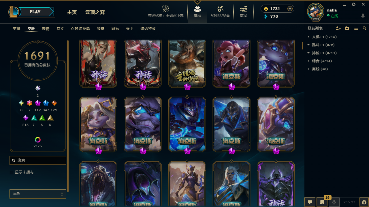 角色等级:1226 角色名:nafla 排位赛:允许 单双排段位:流光翡翠I 灵活组排段位:华贵铂金IV 英雄数量:172 皮肤数量:1693 双人作战段位:无段位 分销起租时长:1
