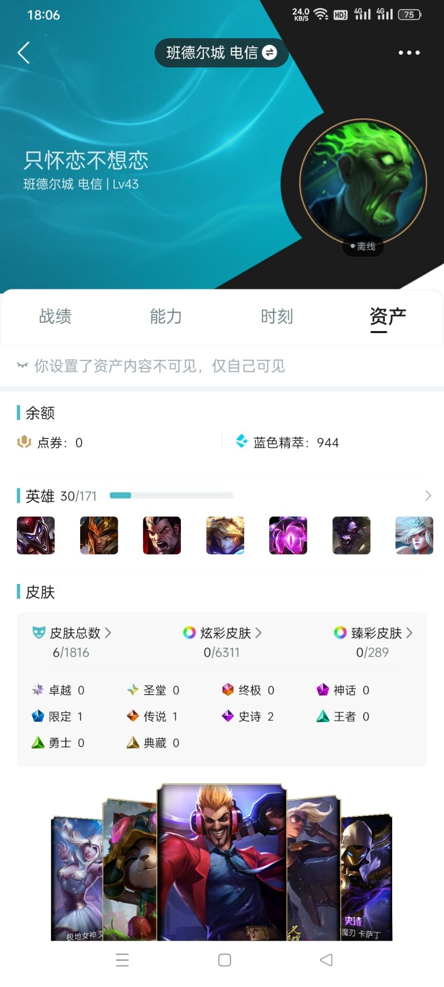 角色等级:43 角色名:只怀恋不想恋 排位赛:允许 单双排段位:- 灵活组排段位:- 英雄数量:30 皮肤数量:6 分销起租时长:1 云顶段位:无段位 双人作战段位:无段位