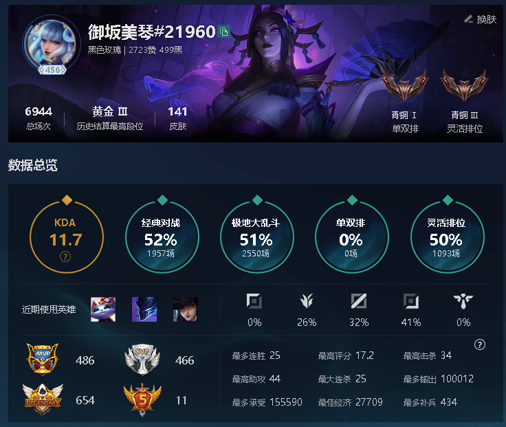 角色等级:457 角色名:御坂美琴 排位赛:允许 单双排段位:不屈白银IV 灵活组排段位:不屈白银IV 英雄数量:172 皮肤数量:141 云顶段位:无段位 双人作战段位:无段位