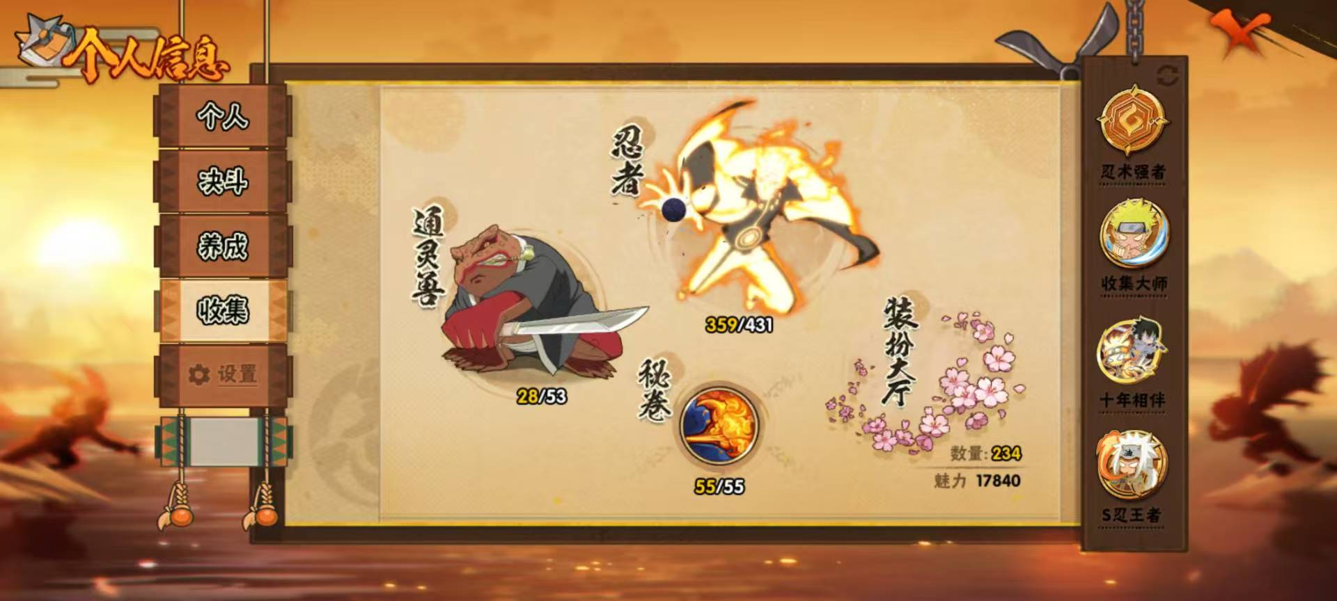 适配系统:安卓 账号类型(腾讯):QQ 分销起租时长:1 战力值:2396W A忍者数量:60 S级忍者数:54