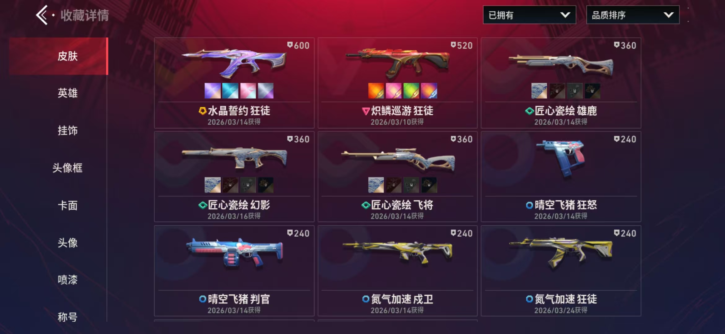 满皮满级水晶誓约狂徒、炽鳞巡游狂徒,幻影-匠心瓷绘,飞将-匠心瓷绘,雄鹿-匠心瓷绘,狂徒-氮气加速,戍卫-氮气加速...